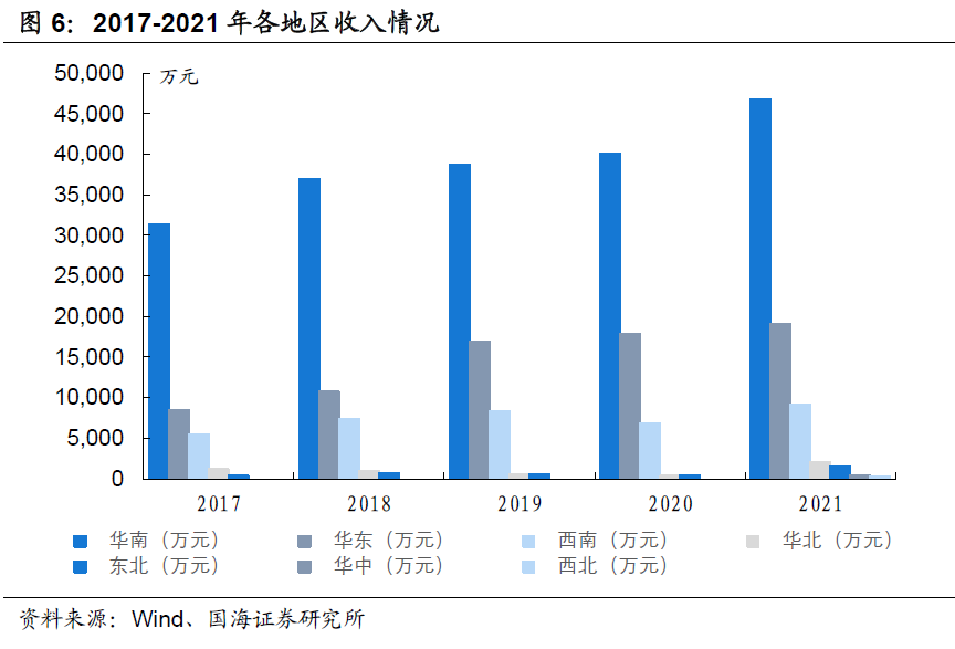 研报菌简评:公司产品结构丰富多样,主要采用直营的方式,收入分布主要集中在华南、华东和西南三地。