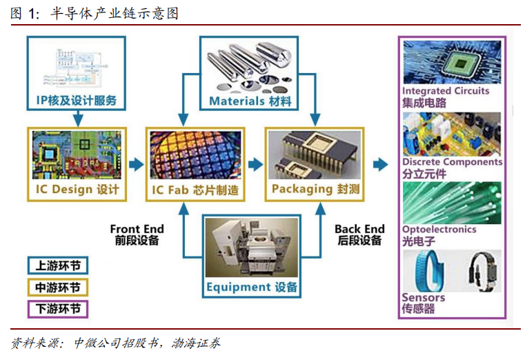 半导体产业链的上游由设计、制造和封测环节提供软件及知识产权、硬件设备、原材料等生产资料的核心产业组成。中游可以分为半导体芯片设计环节、制造环节和封装测试环节。下游为半导体终端产品以及其衍生的应用、系统等。