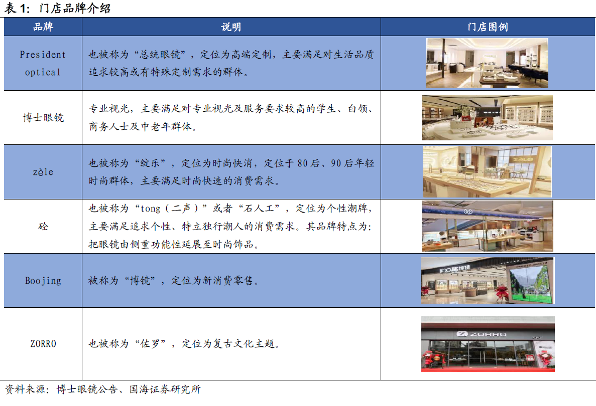公司实行差异化品牌定位,旗下主打四大门店品牌,积极打造自有门店品牌进行多层次市场布局,目前公司拥有六大眼镜零售品牌,并不断丰富品牌内涵,提升品牌效益,定位方向有高端定制、时尚快消、个性潮牌、新消费零售、复古文化主题等等。