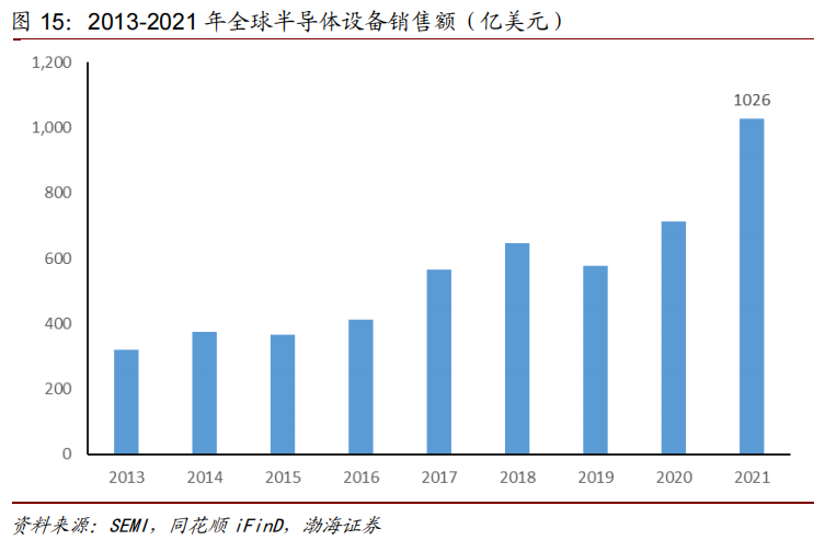 随着2013年以来全球半导体行业的整体发展,半导体设备行业市场规模也实现快速增长。据统计,2013-2020年,全球半导体设备销售额由320亿美元提升至712亿美元,年复合增速达到12.10%。2021年全球半导体设备市场规模突破1000亿美元,达到历史新高的1026亿美元,同比大增44%。其中,中国大陆以296亿美元设备销售额连续第二年成为全球半导体设备最大市场。
