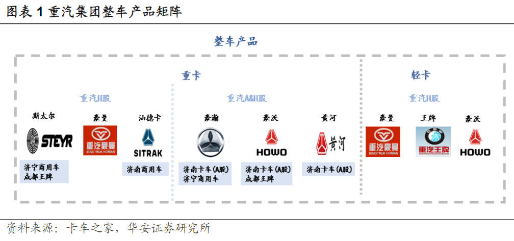 公司是重卡行业龙头,主营业务是制造、销售重卡整车与车桥配件,重卡产品包括黄河和豪沃品牌,涉及自卸车、牵引车、载货车、专用车等多种车型,主要用于物流运输、工程建设、城市清洁与消防等领域。车桥配件由下属济南车桥子公司生产,在优先满足内部配套基础上,向中国重汽集团等其他企业配套。
