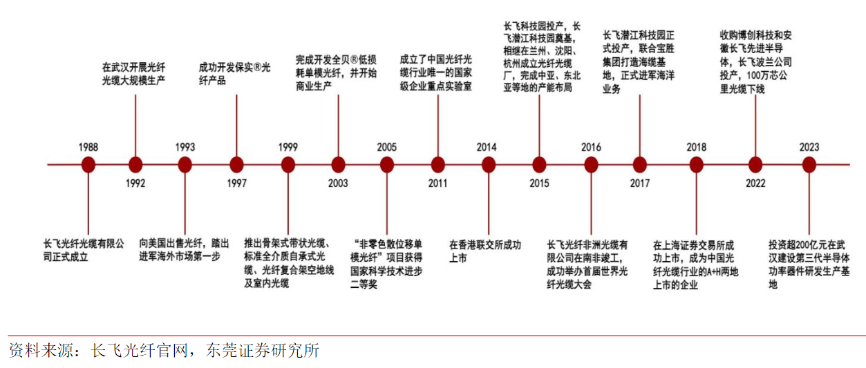 公司是,中国唯一A+H两地挂牌上市的光纤光缆企业,2017年正式进军海洋业务;上游四氯化硒项目投产开始拓展上游材料市场;2020年公司布局光模块、光器件领域,并中标国内主要电信运营商的光模块集采项目,2022年收购并控股博创科技,完善光通信产品矩阵;同年4月参与投资收购启迪半导体积极布局第三代半导体产业。