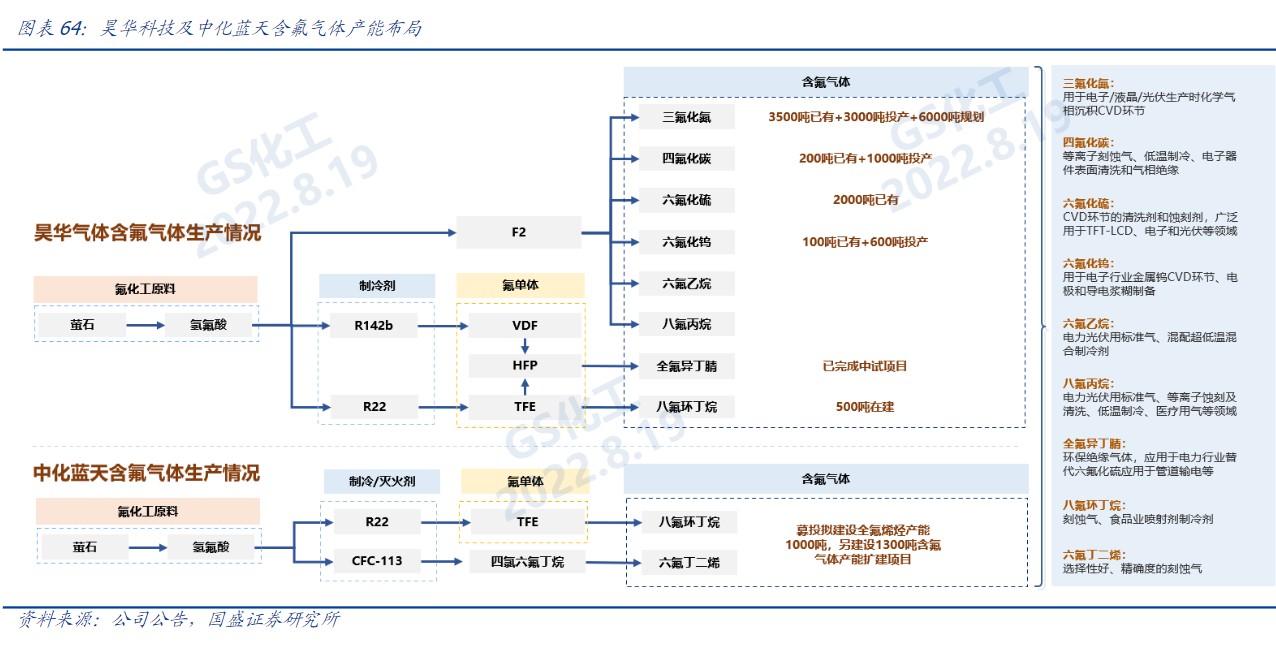 公司含氟电子特气产品系列齐全,产能位列国内前三,已进入一线厂商,旗下黎明院、光明院已成立昊华气体有限公司,形成了具有自主知识产权的特种气体制备综合技术,产品主要为含氟电子气,广泛应用于半导体集成电路、电力设备制造、LED、光纤光缆、太阳能光伏、医疗健康、环保监测等领域。