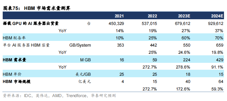 创新方面,AI带动的算力需求快速增长需要存储芯片进行容量与带宽上的配套。以HBM为代表的高性能存储器迎来新的发展机遇。受AI服务器销量增长、单服务器HBM容量提升驱动,预计HBM将在24/25年后成为市场主流,市场规模有望从22年的15亿美元增长到24年的64亿美元。在Ai浪潮驱动下,有望开启存储成长新篇章。