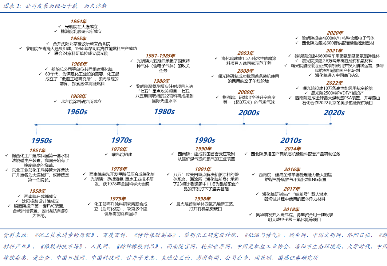 公司前身为西南研究院旗下子公司天科股份,2018年中国昊华将旗下11家核心优质化工科技企业注入天科股份,并于2019年6月改名为昊华科技,使之转型成为中国化工集团旗下化工新材料领域技术平台型上市公司,形成了以12家优质技术型企业为核心的化工新材料平台公司的格局。