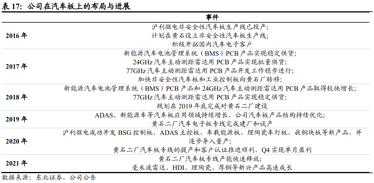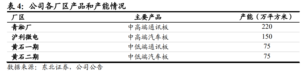 公司拥有三大产能基地:子公司沪利微电、昆山新厂青淞厂以及湖北黄石厂。其中昆山厂和黄石一厂主要生产企业通讯市场板,沪利微电和黄石二厂主要生产汽车用PCB,三大产能基地各具优势,黄石厂是未来主要扩产基地。