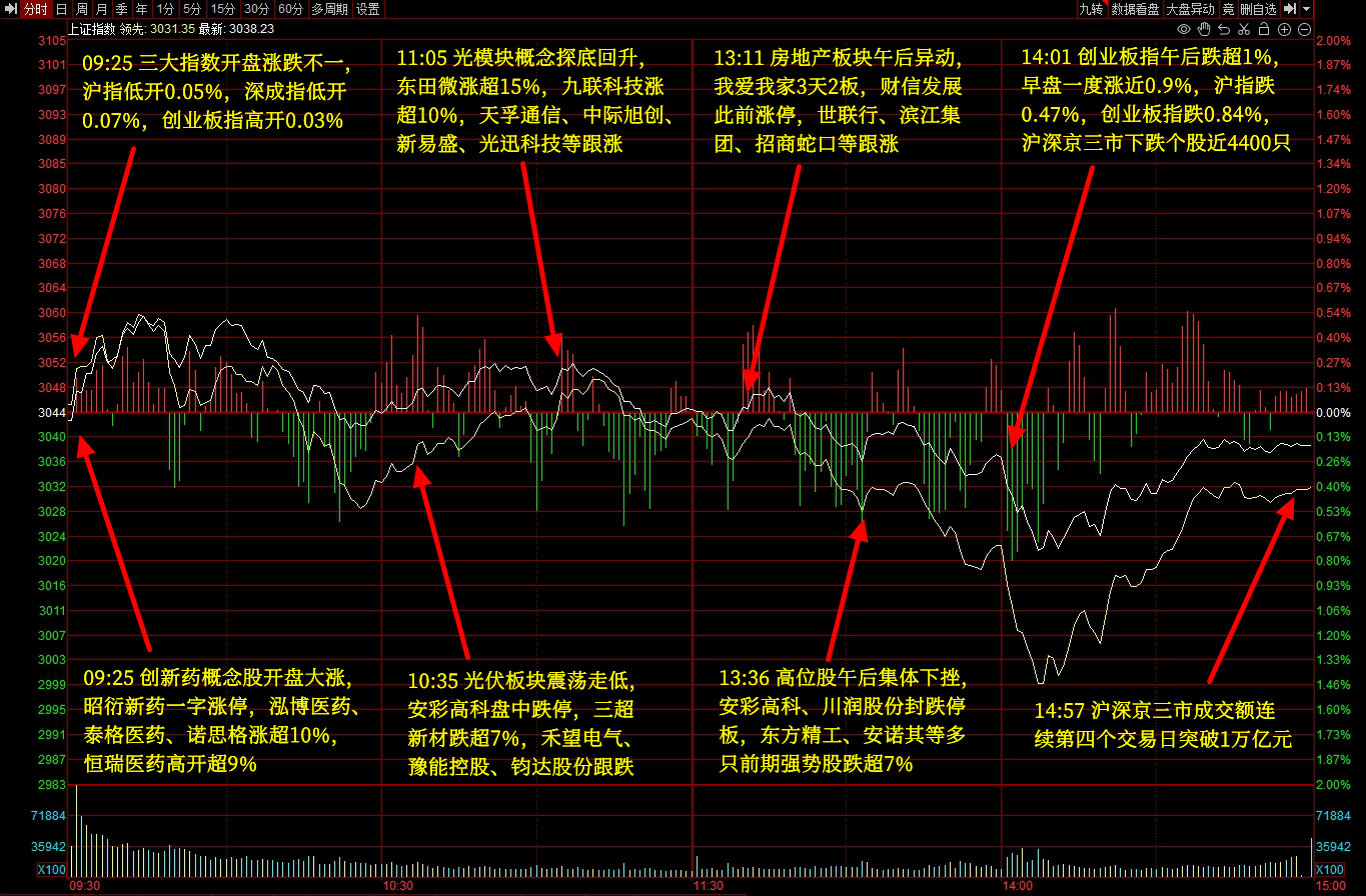 总体上,沪深京三市个股跌多涨少,全市场超3500股下跌。沪深京三市成交额10130亿元。