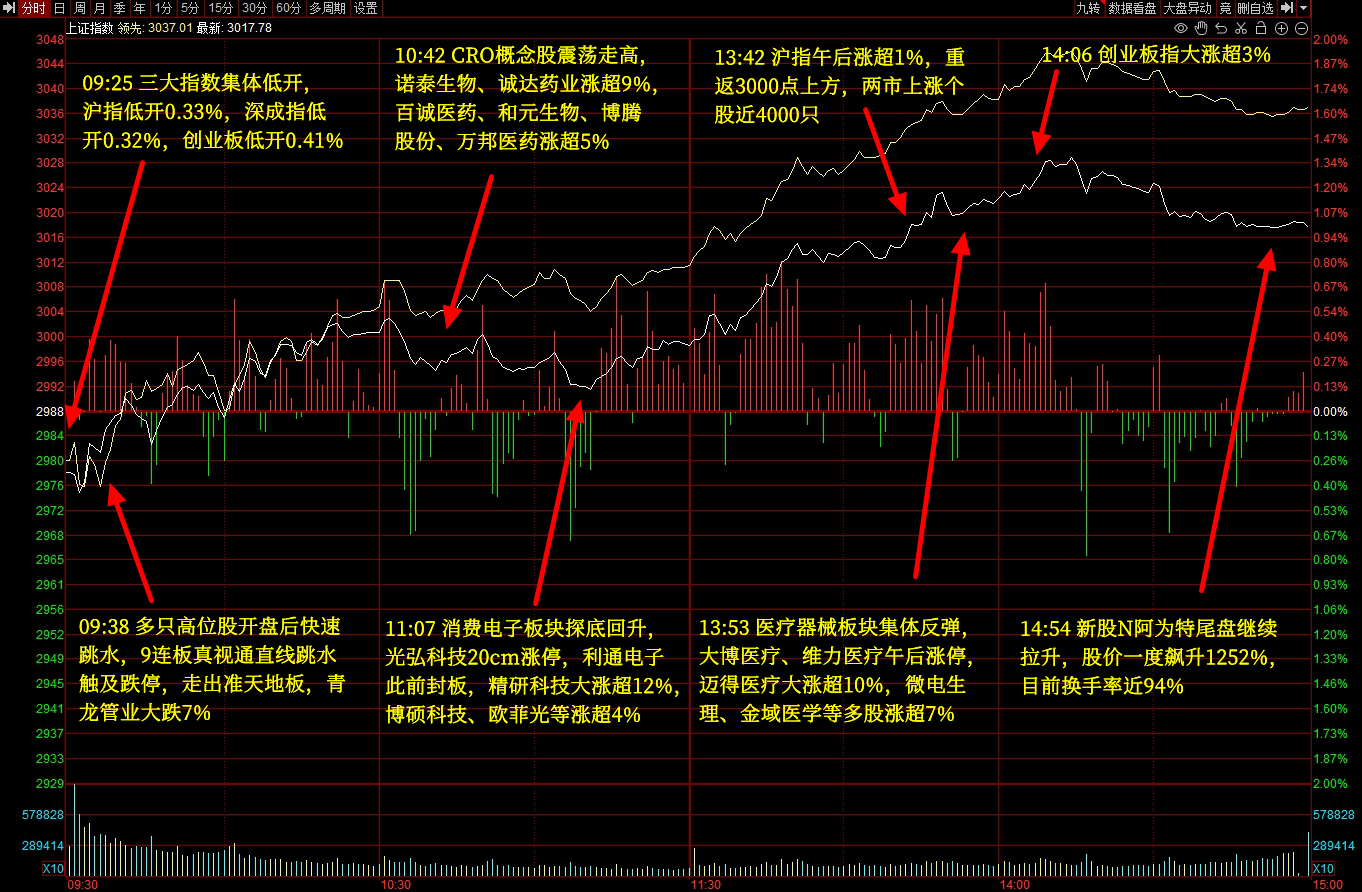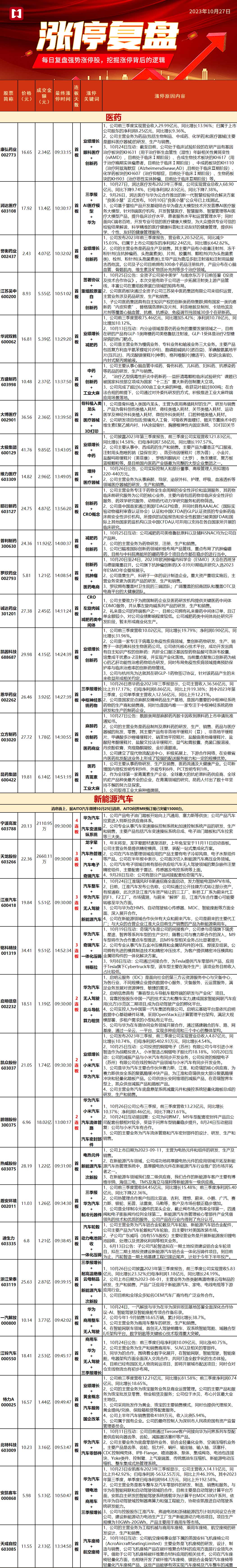 【10月27日】今日周五,大盘全天低开高走,创业板指领涨,沪指收复3000点。盘面上,医药股集体大涨,CRO、创新药方向领涨,凯因科技、诚达药业、昭衍新药、江苏吴中等多股涨停。锂电池、光伏等赛道股展开反弹,科达利、恩捷股份、西藏矿业等涨停。