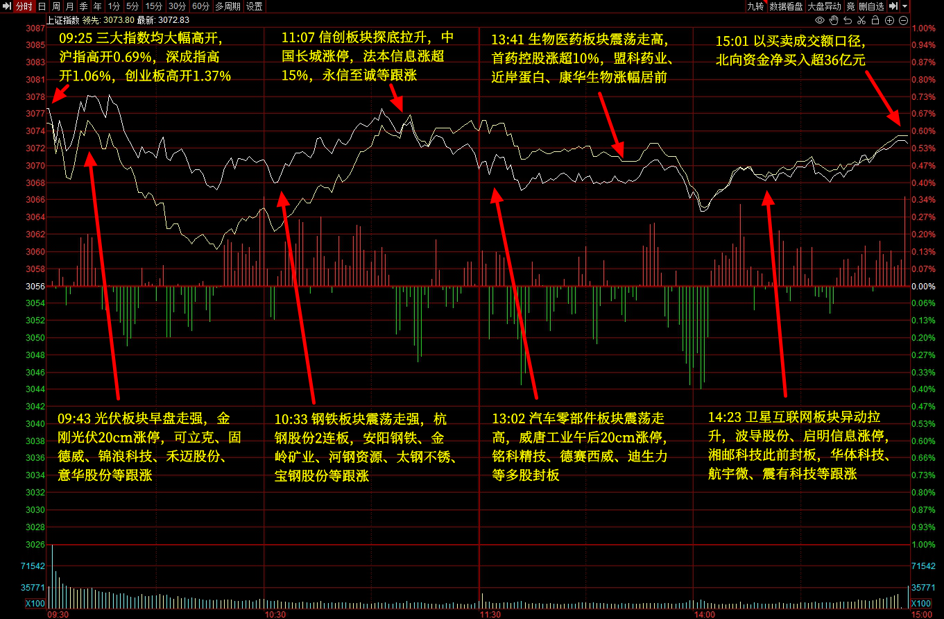总体上,两市个股涨多跌少,上涨超3100家,市场成交额9900亿元,较昨日放量966亿,北向资金净买入超36亿,早盘一度净买入超50亿。