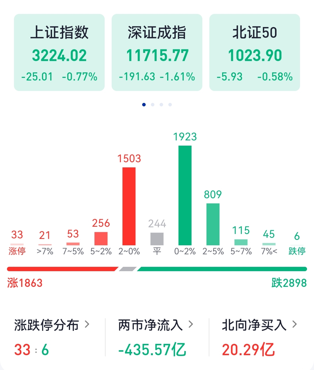 总体上个股跌多涨少,两市超2800只个股下跌。沪深两市今日成交额9141亿,较上个交易日缩量2789亿;北向资金净买入20.29亿。