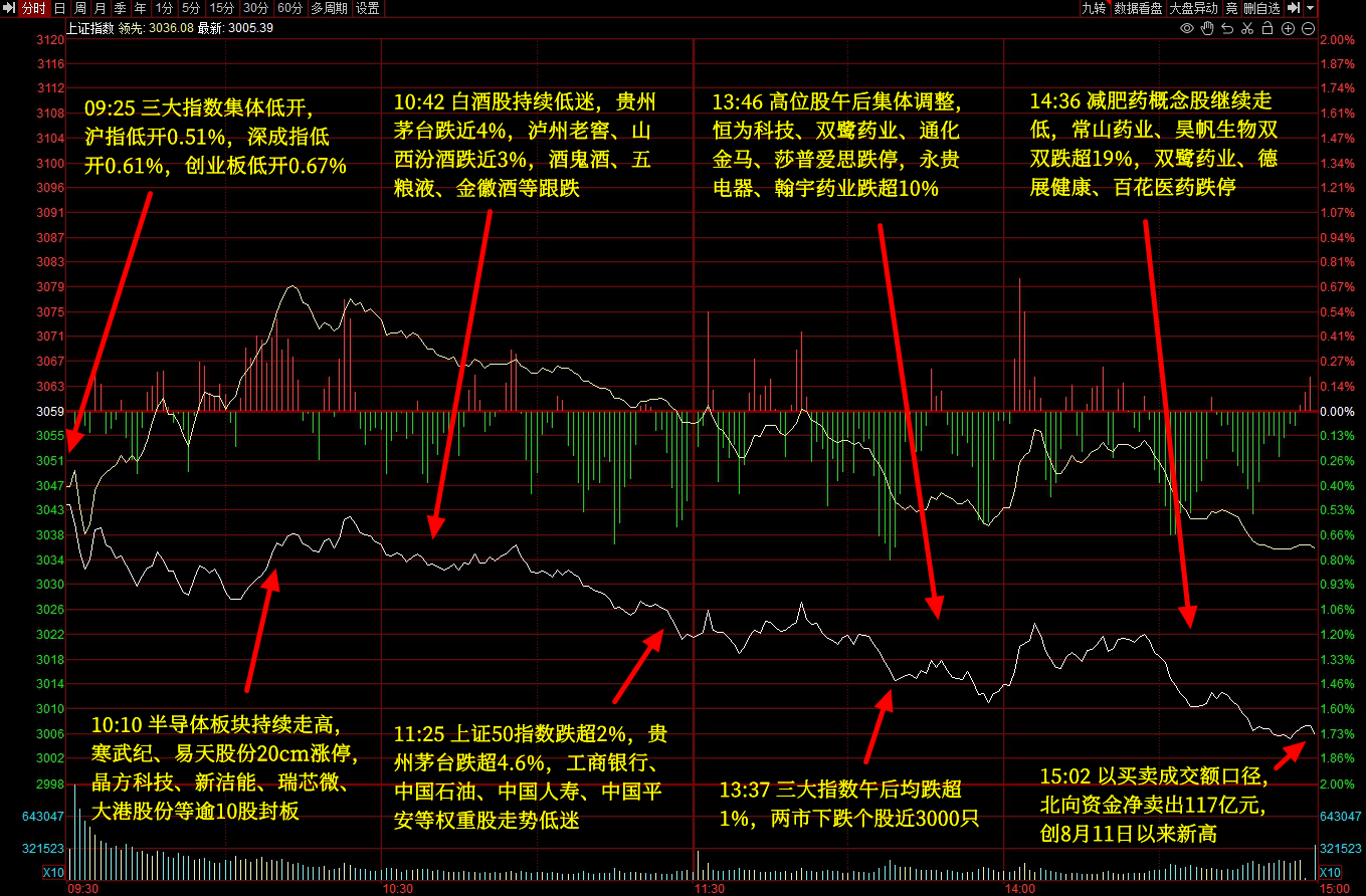 【10月19日】今日周四,A股低开低走,三大指数均创年内新低。截至收盘,沪指跌1.74%,报3005.39点;深成指跌1.65%,报9655.09点;创业板指跌1.28%,报1913.70点;北向资金继续出逃,净卖出超117亿,连续5日净卖出累计近290亿元。
