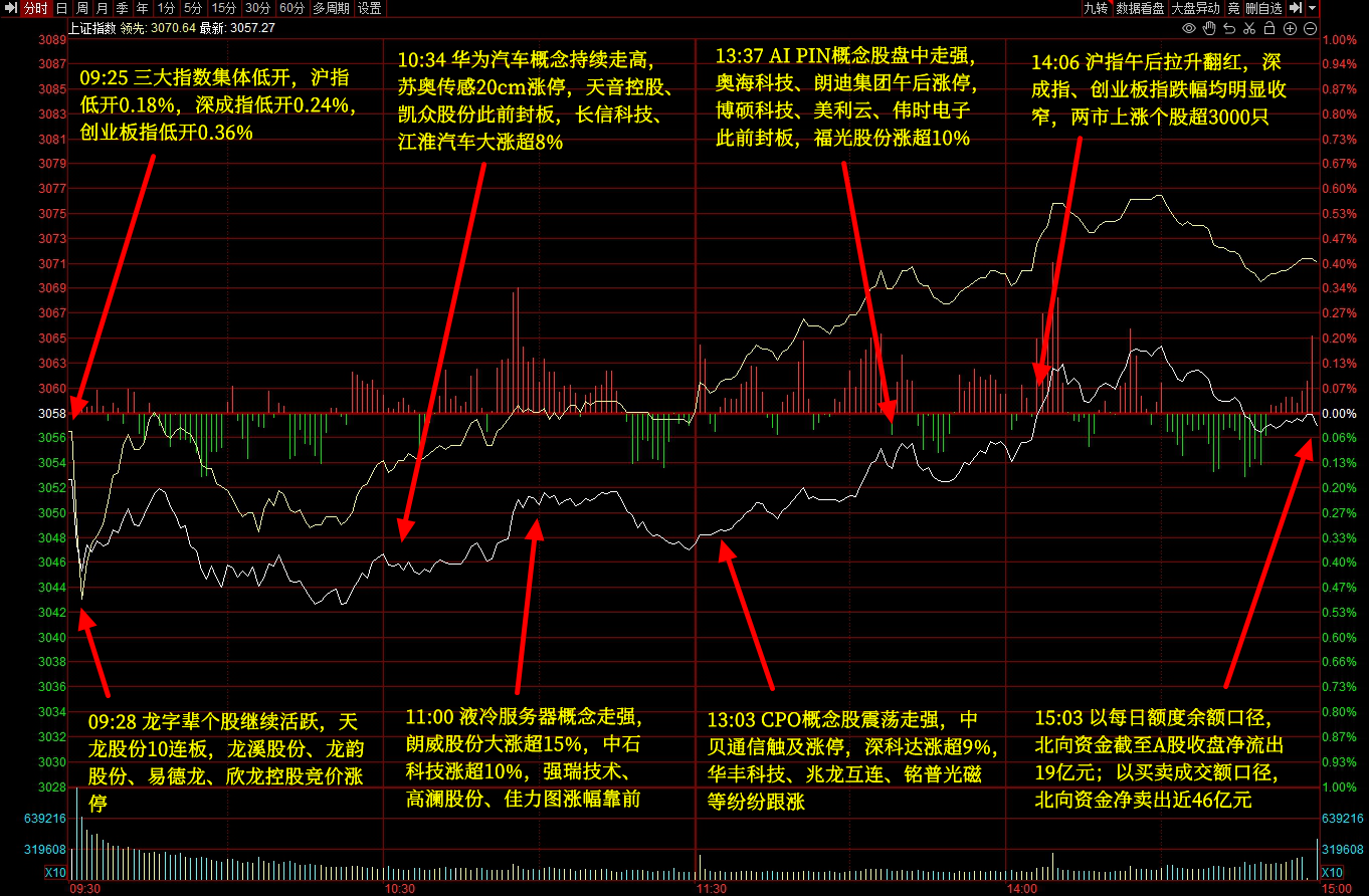 总体上,两市个股涨多跌少,上涨超2700家,市场成交额9930亿元,较昨日缩量712亿,北向资金净卖出超45亿,此前已连续三日净买入。