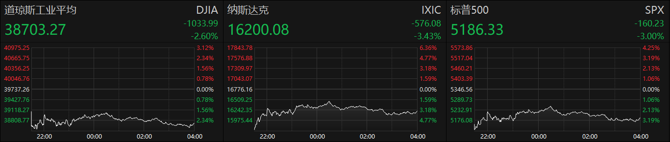 ►美股周一大幅下跌,道指、标普双双创下近两年来最糟糕的一天。分析认为,市场对美国经济衰退的担忧是全球市场崩溃的最主要原因。巴菲特减持苹果加重了美股承受的抛压。截至收盘,道琼斯指数跌2.60%,标普500指数跌3.00%,纳斯达克综合指数跌3.43%。热门中概股相对抗跌,纳斯达克中国金龙指数涨0.25%。