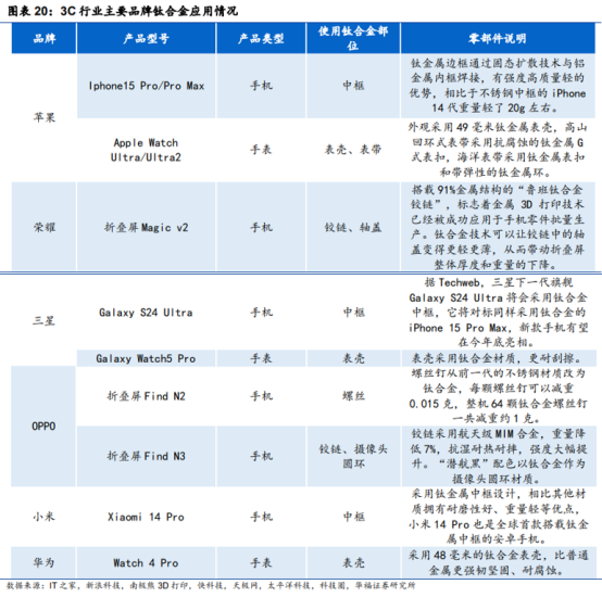 钛合金元年:新技术对消费电子来说,是一个新的噱头和卖点,在硬件性能过剩的情况下,做这些微创新来提升销量的边际作用比较好。目前,苹果15 pro/pro MAX、三星 s24、华为Watch GT3、荣耀Magiv、小米14 Pro等主流3C厂商均开始在高端机型导入钛合金。钛合金能够更好地兼具坚固和轻薄的特点,从而降低手机的厚度和重量,并提高强度,有望成为消费电子材料创新趋势。