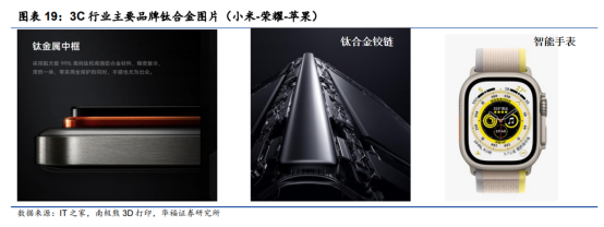 百亿增量市场可期:3D打印技术是通过对金属粉末激光熔融而层层累积一体化成形的增材制造工艺,这就从技术路线上规避了钛合金难加工的属性,未来有望打开巨大市场。从市场空间测算来看,就目前已存在的三款运用钛合金的设备零部件(铰链、手机中框、智能手表)来计算,百亿增量市场可期。