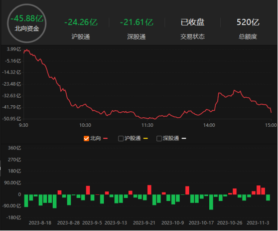1)北向资金动向:11月7日净卖出45.88亿元。宁德时代、中际旭创、新易盛分别遭净卖出11.17亿元、3.91亿元、2.42亿元;东方财富逆势获净买入3.51亿元。