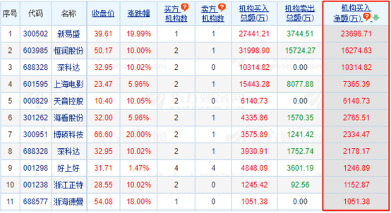 2)龙虎榜机构动向:11月7日,机构参与龙虎榜中个股共涉及26股,其中11股被机构净买入,新易盛被净买入最多,为2.36亿元。