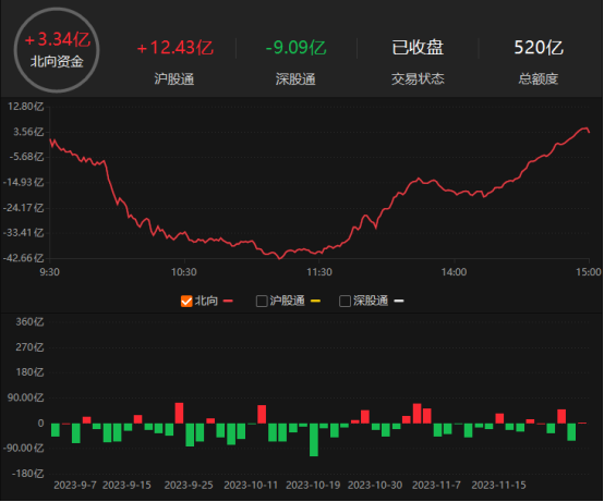 1)北向资金动向:11月27日净买入3.34亿元。海光信息、药明康德、汇川技术分别获净买入5.4亿元、3.11亿元、2.79亿元。招商银行净卖出额居首,金额为3.48亿元。