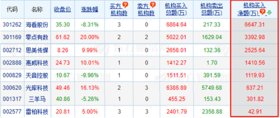 2)龙虎榜机构动向:11月27日,机构参与龙虎榜中个股共涉及20股,其中8股被机构净买入,海看股份被买入最多,为6647万元。