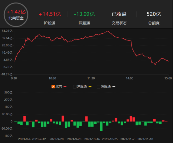 1)北向资金动向:11月21日净买入1.42亿元。贵州茅台、欧菲光、阳光电源分别获净买入3.71亿元、3.56亿元、2.93亿元。比亚迪净卖出额居首,金额为2.38亿元。