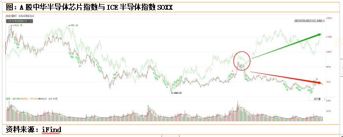 今年中美半导体有个很显著的差别,在英伟达一枝独秀的引领下,A股中华半导体芯片指数大幅跑输美股费城半导体指数,如下图,差距很明显。