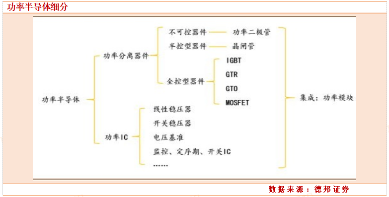 功率半导体是电子装置中电能转换与电路控制的核心,主要用于改变电子装置中电压和频率、直流交流转换等。功率半导体可分为功率IC和功率分立器件两大类,二者集成为功率模块(包括MOSFET/IGBT模块,IPM模块,PIM模块)。