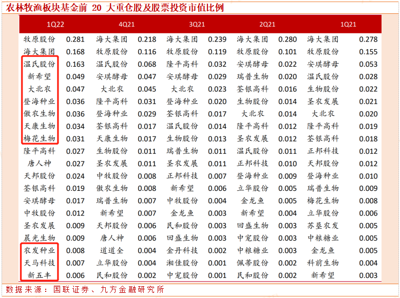 从机构配置来看,公募基金农林牧渔板块前20大重仓股中,牧原股份上升为持仓第一大市值,梅花生物、晨光生物、农发种业、天马科技、新五丰新晋前 20 重仓名单。此外温氏股份、新希望、大北农基金投资股票市值比分别为 0.16%、0.05%、0.05%,分别环比变化 0.100、0.040、0.002pct。