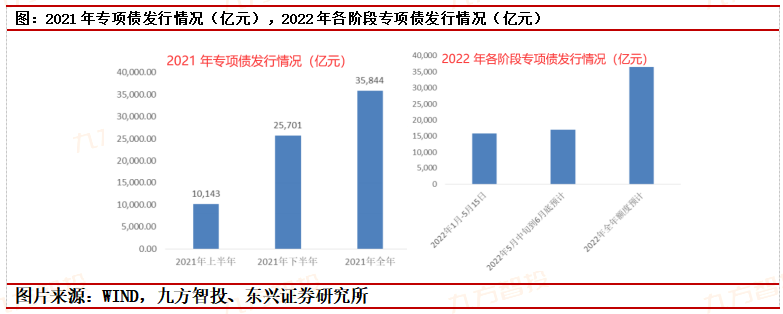 在2021年下半年和2022年1季度地方政府专项债集中发行的带动下,2022年上半年基础设施项目建设将进入集中释放阶段。2021年下半年到2022年5月共发行专项债规模4.3万亿,并且超过80%的专项债资金已经拨付给项目单位,2022年专项债资金支持项目开工率已经超过75%。