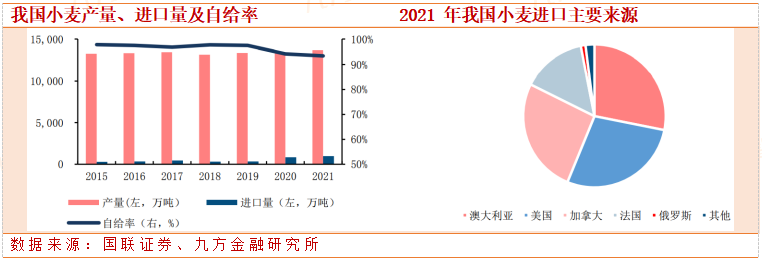 我国小麦自给率超93%,澳大利亚和美国为我国进口小麦主要来源。2021年我国小麦产量13695万吨(同比+2.01%),小麦自给率93.34%,仍然保持在较高水平。