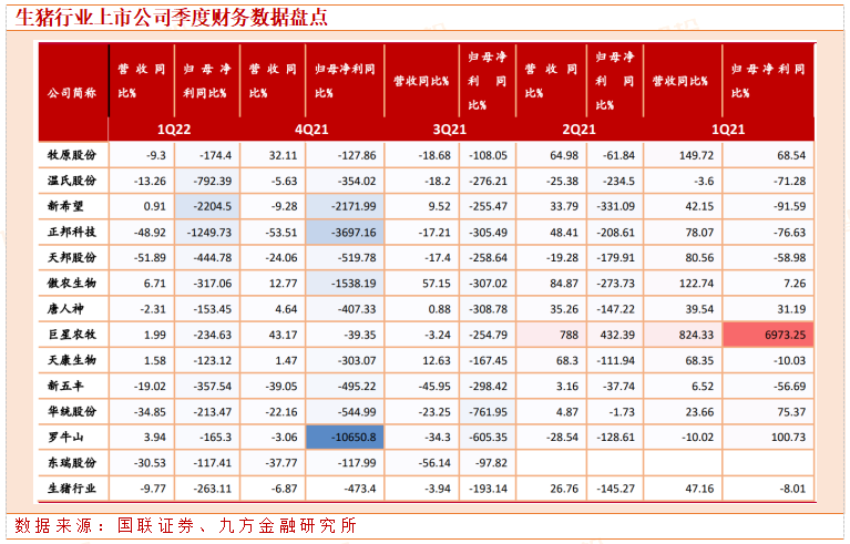 生猪板块22Q1营收同比下降 9.77%,归母净利润同比下降263%,猪价低迷、饲料涨价影响,生猪养殖行业仍然处于深亏期,收入与利润同比下降显著。其中,营收增速排名前三的分别为傲农生物、罗牛山、巨星农牧,营收增速分别 6.71%、 3.94%、1.99%;净利润增速排名前三的分别是东瑞股份、天康生物、罗牛山,利润增速分别是-117.41%、-123.12%、-165.3%。