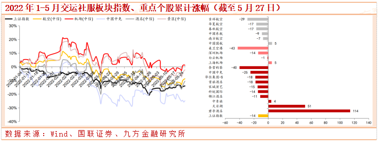 2022.1.1-2022.5.27,春节前出行板块表现突出,节后需求、市场情绪接连受香港疫情、深圳疫情、上海疫情以及油价冲高影响,但整体仍跑出相对收益。各子板块表现如下: (1)累计绝对收益:机场+1%、景区-2%、航空-9%,酒店-11%、中免-25%; (2)累计相对收益:机场+15%、景区+12%、航空+5%、酒店+3%、中免-11%。