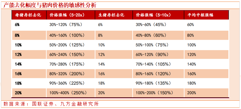 能繁母猪存栏与生猪价格反向变动,生猪价格涨幅为前移 10 个月的母猪存栏去化幅度的 5-20 倍;生猪存栏下降幅度与猪价反转幅度呈现负相关,猪价涨幅约为生猪存栏降幅的 5-10 倍。