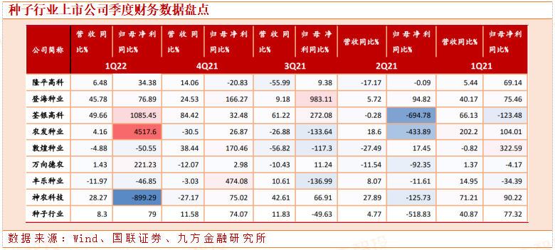 种子板块22Q1营收同比增速8.3%,归母净利润同增79%,受大宗农产品涨价影响,农户种植积极性提升、种子单价上涨,提振板块利润表现。其中,荃银高科、登海种业、神农科技一季度营收增速排名前三,营收增速分别 49.66%、45.78%、 28.27%;从归母净利润增速看,农发种业、荃银高科、万向德农排名前三,利润增速分别为 4517%、1085%、221%。