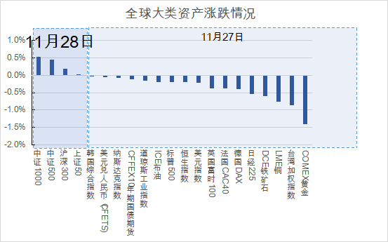 11月28日,市场整体仍是窄幅震荡行情,上证指数日内振幅尚不足一个百分点,最终小幅收涨0.23%,中证500、中证1000等中小盘指数表现相对较好。