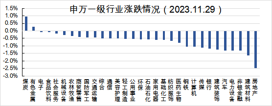 11月29日A股多数行业下跌,仅煤炭和汽车行业小幅上涨,银行、保险、地产、基建等板块跌幅相对较大。其中,煤炭行业本日上涨0.96%,且MACD指标仍在上行,顶背离现象仍然存在;而银行行业本日下跌1.17%,MACD指标也由正转负,并发出底背离信号,但底背离现象能否被证实仍需观察。