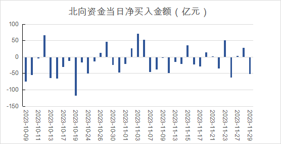 11月29日,北向资金再度出现了较大规模的净流出,陆股通整日净流出规模为50.80亿元。其中,沪股通整日净流出19.84亿元,深股通整日净流出30.96亿元。
