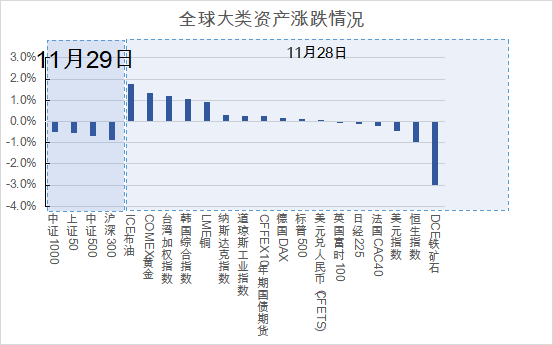 股指方面,11月29日A股成交与昨日基本持平,但K线基本是一根实体阴线,且大致反包了昨日的阳线,短期来看指数仍有下跌的可能性。