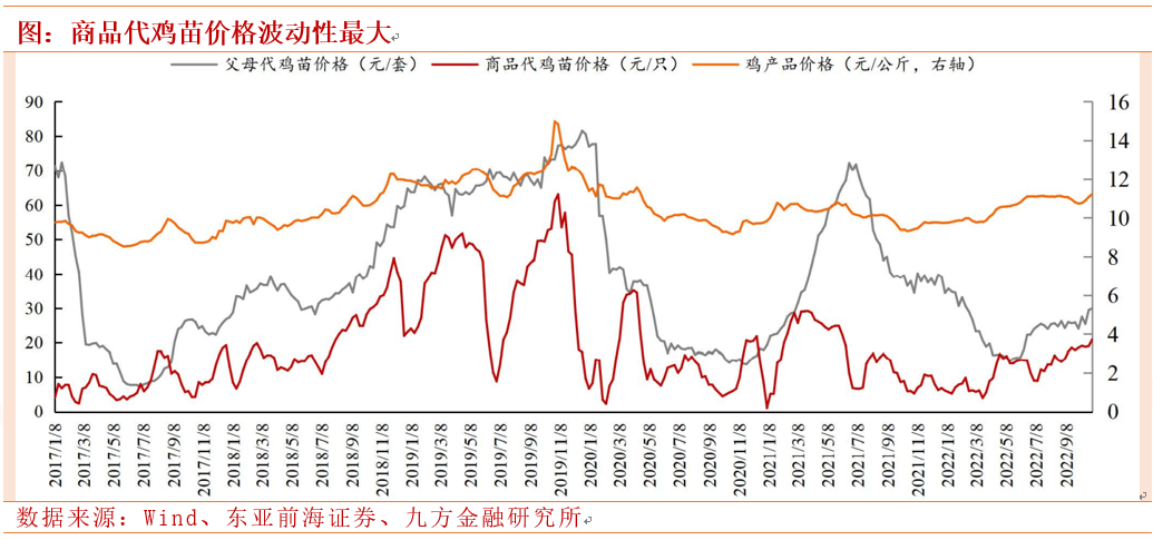 因此,由于商品代鸡苗养殖周期较短,养殖端可以根据下游的需求灵活调节供给给市场终端的商品代肉鸡数量,然而却无法灵活调整上游父母代传导至商品代鸡苗的供给水平。对需求的快速调节叠加供给调整的相对滞后,商品代鸡苗价格波动性最大。