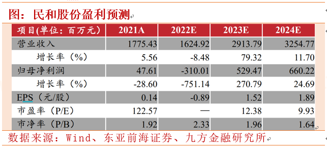 预计2022-2024年公司归母净利润为-3.10/5.29/6.60亿元,当前股价对应2023/2024年PE分别12.38/9.93倍。