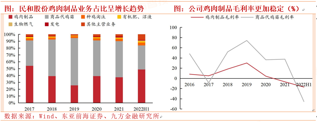 民和股份是国内商品代鸡苗龙头,产业链布局持续完善,是中国最大的父母代笼养种鸡养殖企业。公司已在白羽鸡养殖行业深耕二十余年,建立起了以父母代肉种鸡饲养、商品代肉鸡苗生产销售为核心,集肉鸡养殖、屠宰加工、有机废弃物资源化开发利用为一体的较为完善的循环产业链,并进一步发展熟食深加工业务,向下游延伸产业链。