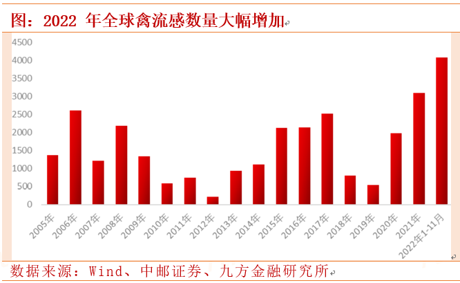 全球多国正遭遇史上最严重禽流感疫情。据WAHO数据,截至11月底,2022年全球家禽流感共发生4082起,家禽死亡及扑杀数量9392万只。目前禽流感已涉及全球67个国家和地区,其中欧洲、北美洲较为严重。