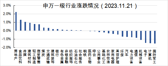 11月21日,市场出现了高开低走的情况,上证指数上午一度上涨近0.70%,但午后迅速翻绿,截至收盘反而下跌0.01%。虽然本日市场表现不佳,但沉寂许久的房地产板块却再度爆发,申万地产指数整日上涨2.23%。本日房地产行业的反攻,主要原因在于市场对于房地产政策预期再起。基于宏观基本面,我们认为当前正是新一轮房地产政策出台的时间点,参考去年11月和今年7月两轮房地产板块的表现,本轮行情可能会类似“三支箭”行情,在政策预期升温、政策尚未落地阶段,地产板块后续仍有上涨的空间。