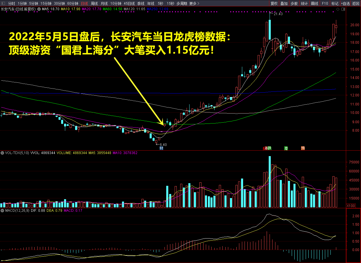 因为,我们已经知道“国君上海分”是善庄,所以它买入的票,不会一日游,可以大胆的跟踪。长安汽车后来的走势, 大家有目共睹,2个月时间不到股价翻倍。
