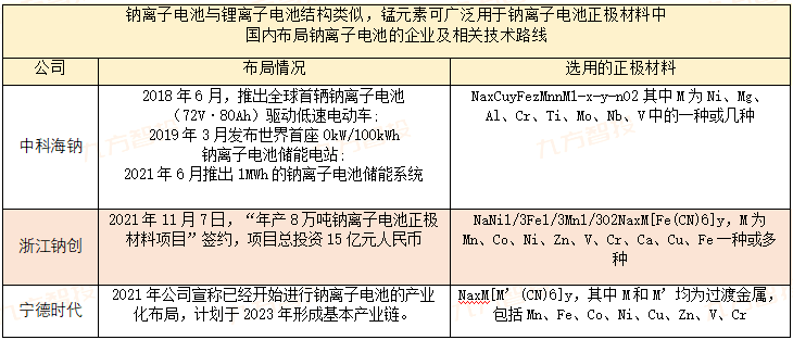 钠离子电池与锂离子电池结构类似,锰元素可广泛用于钠离子电池正极材料中。目前研究的钠离子电池正极材料主要包括过渡金属氧化物体系、普鲁士蓝化合物体系、聚阴离子化合物体系等。