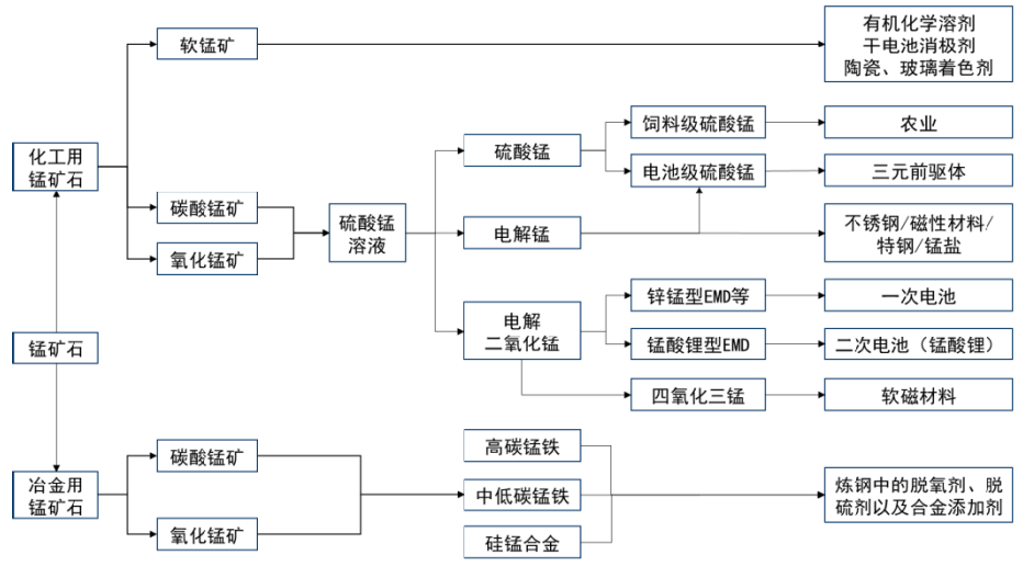 2.硫酸浸出锰矿石制备硫酸锰,再经电解、除杂或氧化等工艺后获得各类高纯锰化合物。