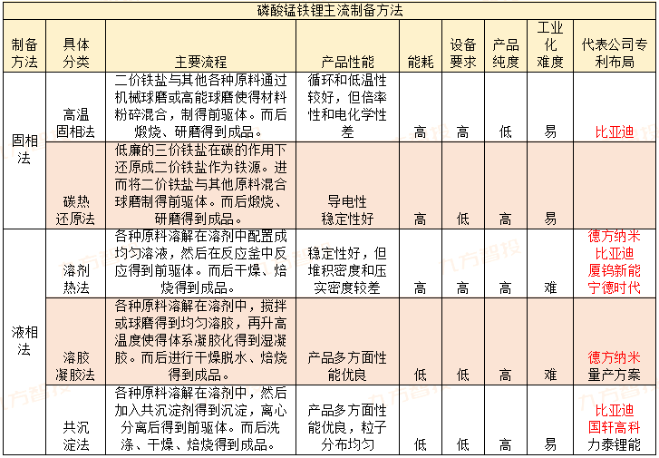 各公司制备磷酸锰铁锂方法主要分为固相法与液相法。