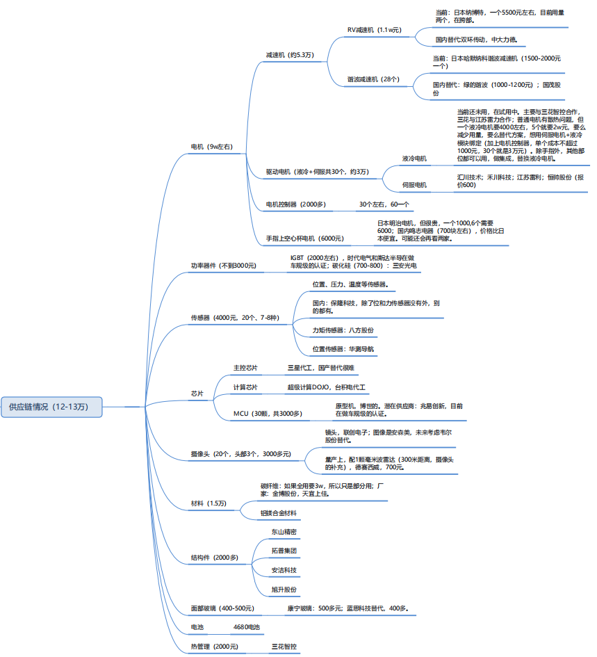 从市场当中流传的一张思维导图来看,作为原型机的Optimus,确实国内尚无公司直接进入,但是潜在的供应商却众多,且潜在的销售体量巨大,足以拉动一波相关中小公司产生了近一个月以来的翻倍行情。