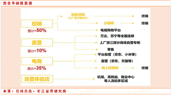 (1)渠道结构均衡,线上线下之比为42:52,线上B2C、电商平台入库、线下经销商、直营门店都有涉及且均衡。