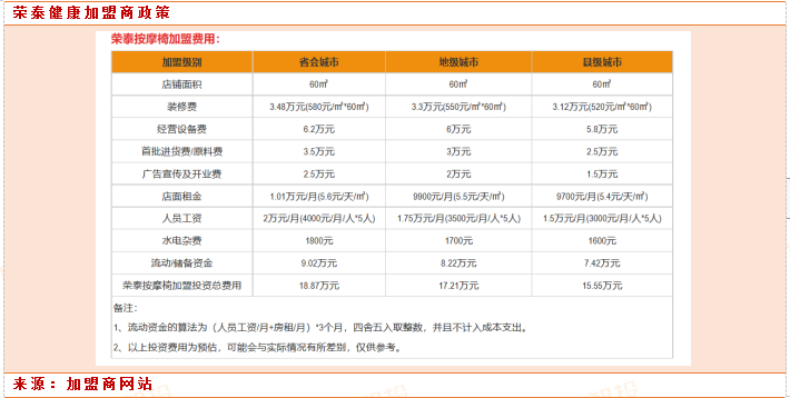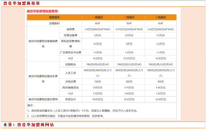 (3)市场宣传倍轻松更加自主,荣泰和奥佳华对于经销商的品牌推广协助,省会城市倍轻松加盟基础费用需要的广告费为7000元,而荣泰健康和奥佳华分别需要25000元和15000元。