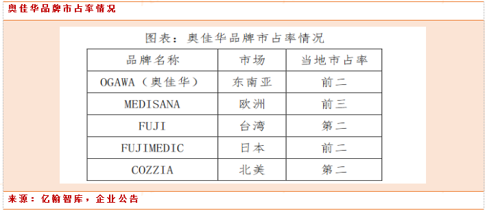 在品牌力上的优势,相对其他企业,奥佳华品牌矩阵成型,不同品牌面向不同市场。海外市场中,东南亚有“OGAWA奥佳华”,中国台湾有“FUJI”,日本有“FUJIMEDIC”,美国有“cozzia”,欧洲有“medisana”。上述品牌扎根于本土市场,有较长时间的品牌运营积累,前四个按摩椅品牌在当地的市占率均在前二,“medisana”品牌在欧洲的市占率也排在前三。